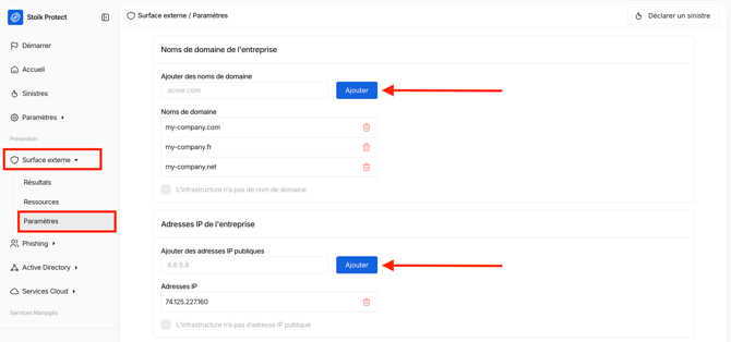 - Les résultats restent visibles même si seuls des domaines ou des adresses IP sont saisis. Toutefois, des bannières d'avertissement vous inviteront (sur Stoïk Protect et dans le récapitulatif mensuel) à finaliser la configuration.