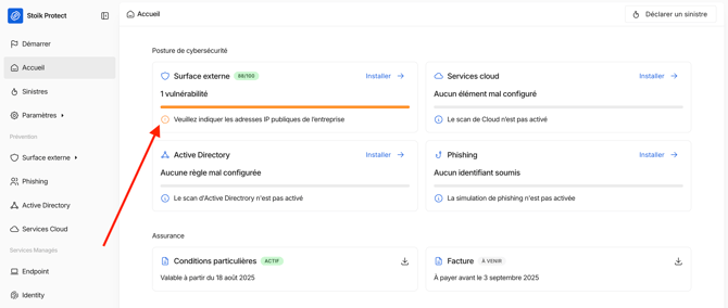 - Si vous avez souscrit votre contrat d'assurance cyber par le biais d'un questionnaire, les adresses IP saisies dans le questionnaire sont importées automatiquement dans Stoïk Protect.
