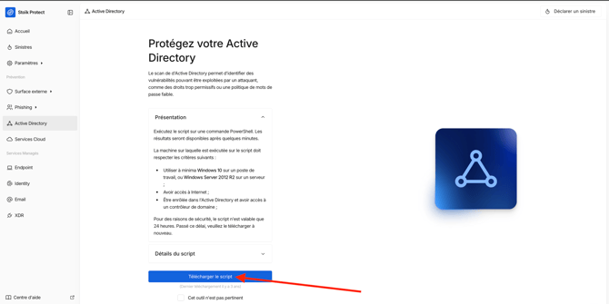💡 Si le script d'analyse AD ne se télécharge pas, vos paramètres de sécurité le bloquent peut-être. Vérifiez si le fichier apparaît dans l'onglet "Téléchargements" de votre explorateur de fichiers. Si le problème persiste, modifiez les paramètres de sécurité pour autoriser les téléchargements. - Exécutez le script sur une console Powershell, depuis un end-point respectant les prérequis mentionnés en 1.