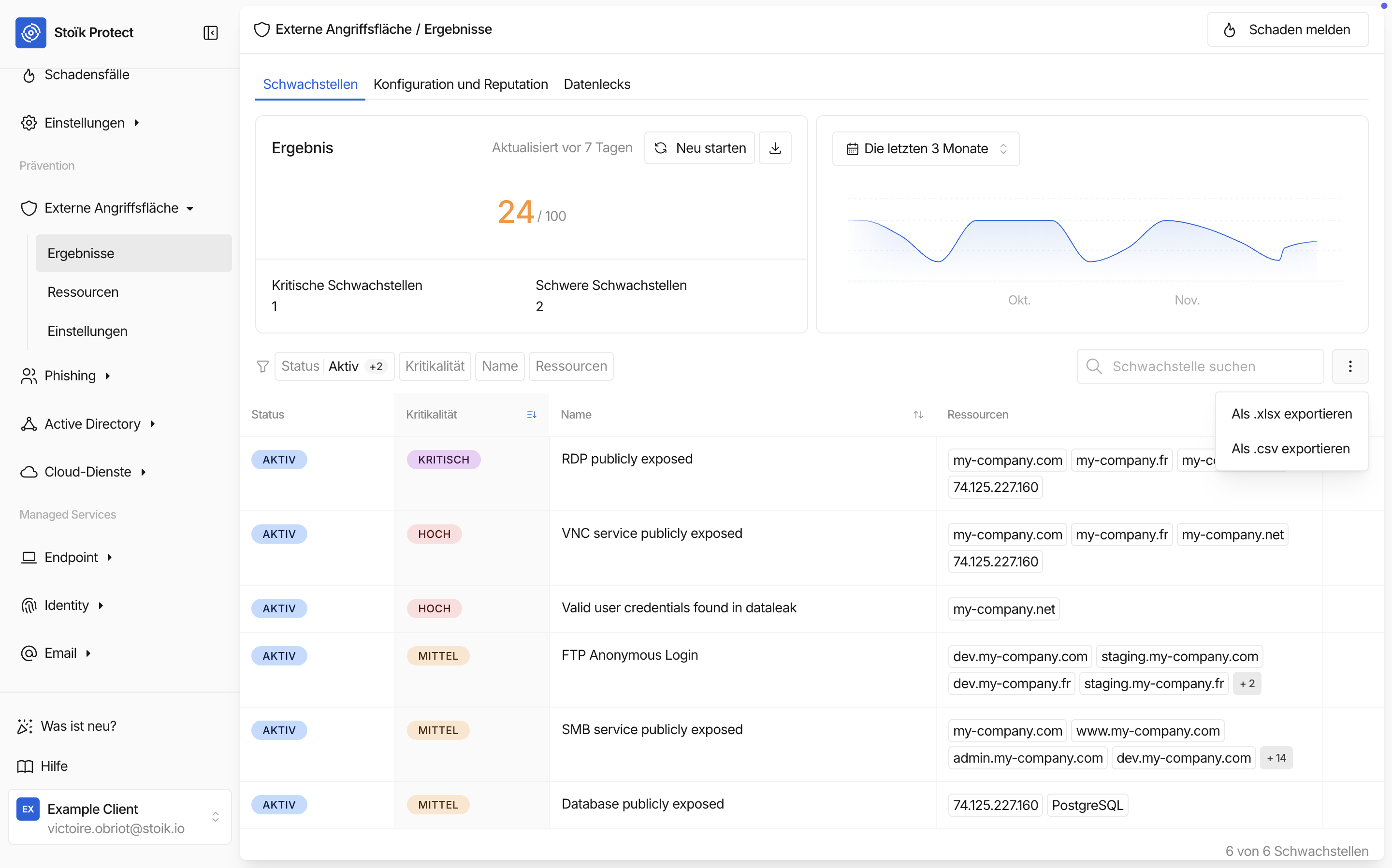 Die Tabellenkomponente in Stoïk Protect wurde vollständig neu gestaltet, um eine schnellere, flüssigere und intuitivere Datennavigation zu ermöglichen. Dieses Update verbessert die Lesbarkeit und Interaktion erheblich.