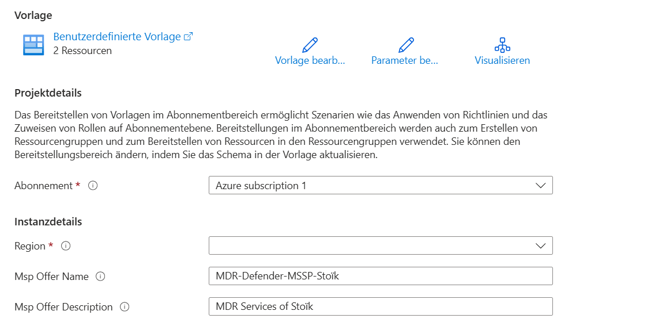 Wählen Sie das Azure-Abonnement und die Region aus, für das die Delegierung erstellt werden soll. Lass Sie alle anderen Felder so, wie sie sind, weil sie in der Vorlage schon vorausgefüllt sind.